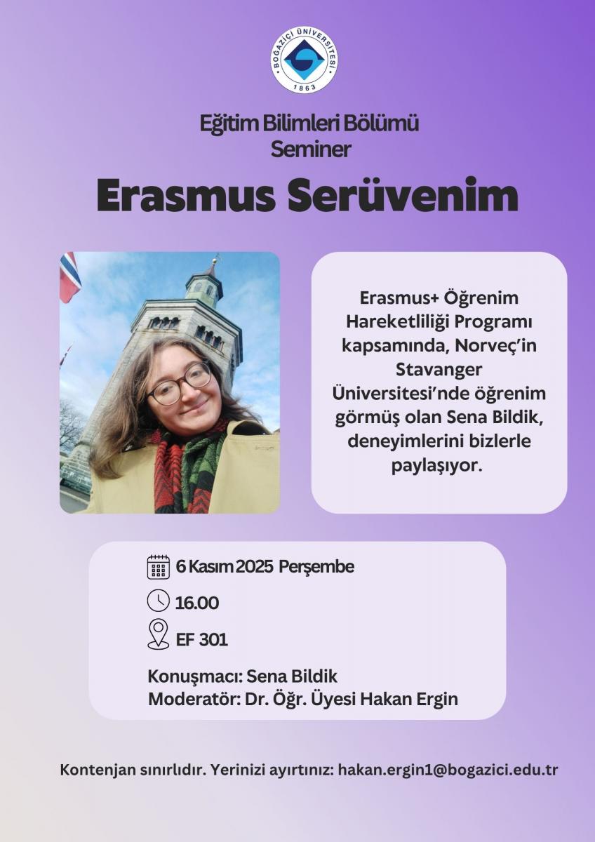 As part of the internationalization of higher education, peer experience sharing will take place through a seminar titled “My Erasmus Journey”. Sena Bildik, a double major student in the Guidance and Psychological Counseling Undergraduate Program and the Preschool Education Undergraduate Program, will share her experiences from her Erasmus+ Study Mobility at the University of Stavanger in Norway.